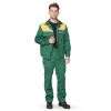 Костюм состоит из куртки и брюк. Основной цвет зеленый, кокетка, канты и обработка - желтого цвета. Куртка короткая с поясом на резинке по-бокам.
