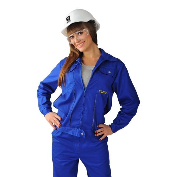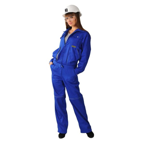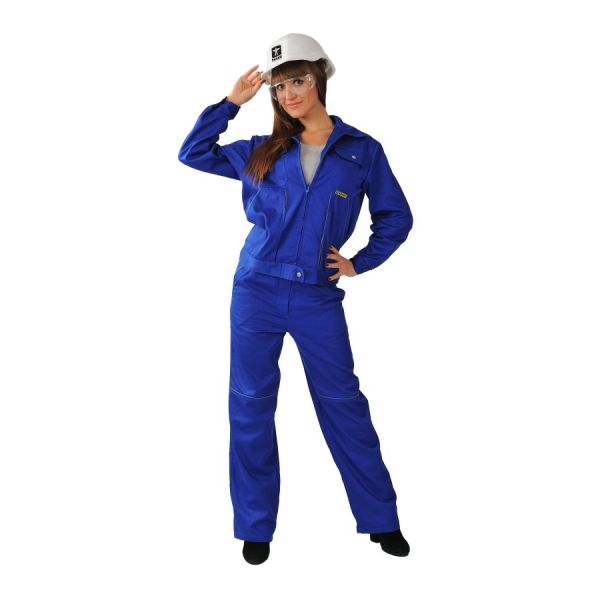 Костюм состоит из укороченной куртки с притачным поясом, центральной застежкой на молнию и брюк с регулируемым объемом по талии. Рукава куртки с манжетами на кнопках. Эффектное сочетание фурнитуры в цвет отделочной ткани.