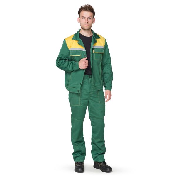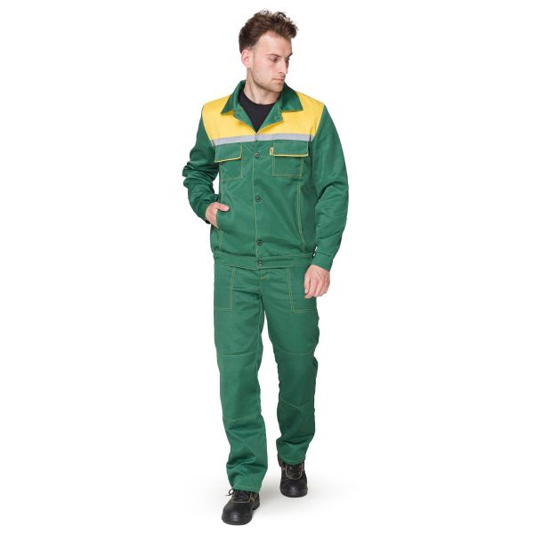 Костюм складається з куртки та штанів. Основний колір зелений, кокетка, канти та обробка – жовтого кольору. Куртка коротка з поясом на резинці з боків.